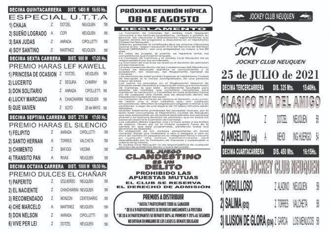 La otra prueba central de la jornada, será en el turno siguiente, el Especial Jockey Club, a correrse sobre 450 metros, a partir de las 16:15. Parte como favorito el local, Orgulloso que viene de triplete, en Neuquén, Catriel y 25 de Mayo (La Pampa) y tendrá como rivales a Salima de Valcheta e Ilusión de Gloria de Los Menucos que ya se enfrentaron entre ellos con victoria para esta última.