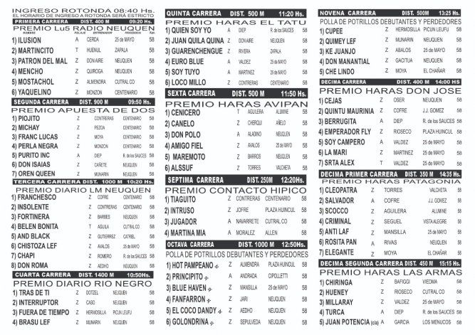 Entre las carreras de larga distancia, se destaca el Especial UTTA sobre los 1.400 metros, a las 16:50, con la participación de Chajá, Sueño Logrado, San Antonio (todos de Neuquén) y San Judás (Cipolletti).