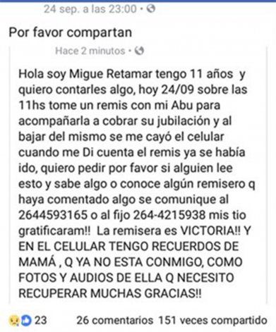 "Hoy 24/9 sobre las 11 tomé un remis con mi abu para acompañarla a cobrar su jubilación y al bajar del mismo se me cayó el celular. Cuando me dí cuenta el remis ya se había ido. En el celular tengo recuerdos de mamá que ya no está conmigo como fotos y audios de ella que necesito recuperar. Muchas gracias", escribió el chico redes sociales.