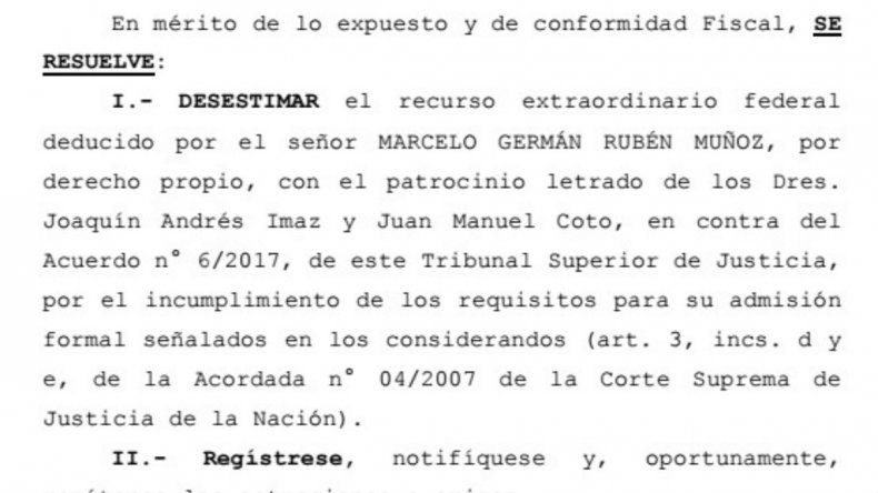 El Tribunal Superior de Justicia rechazó el recurso extraordinario presentado por el ex juez Marcelo Muñoz, destituido en el jury por mal desempeño de sus funciones.