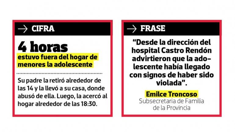 A partir de lo ocurrido, la Subsecretaría de Familia de la provincia separó a la directora del Hogar de Menores Amancay de su cargo tras comprobar que había autorizado la salida de la adolescente acompañada de su papá. “Estaba expresamente prohibido y dichas visitas sólo se podían producir bajo supervisión”, expresaron en un comunicado desde el Gobierno.