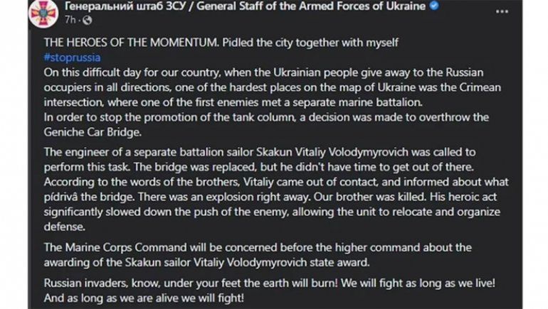 Un soldado del ejército de Ucrania se inmoló junto a un puente en la región de Kherson, cerca de Crimea, en un acto heroico para frenar a las tropas rusas. El soldado fue identificado por el Estado Mayor de las Fuerzas Armadas como Vitaly Shakun, que estaba vigilando el puente de Henichesk, en la región de Kherson, cuando los rusos avanzaron y lo minaron.