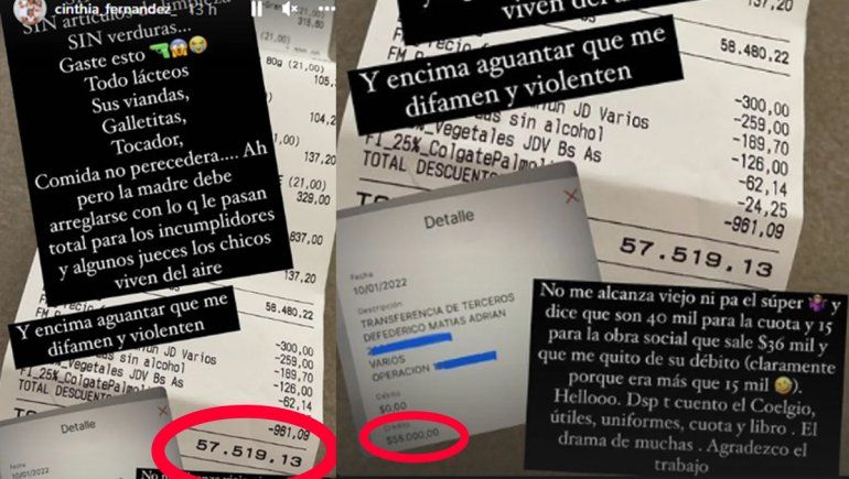 Además del ticket de la compra, Fernández compartió una captura del comprobante de la cuota alimentaria que depositó Matías Defederico el pasado 10 de enero, con la suma de 55 mil pesos. “No me alcanza, viejo, ni para el super”, aseveró Fernández y continuó: “Y dice que son $40 mil para la cuota y $15 mil para la obra social, que sale $36 mil. Y que me quitó de su débito (claramente porque eran más de $15 mil)”.