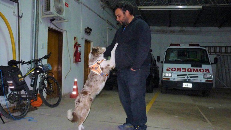 En un pequeño carrito atado a la bici viaja Dina, una border collie de un año y medio que se especializa en búsqueda y rescate. “En el viaje mantenemos su entrenamiento a través de juegos. Necesita conocer otras ciudades y personas para habituarse cuando se necesite su experiencia para una situación de búsqueda”, contó Nicolás.