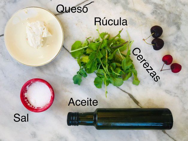 Lavar las cerezas e ir cortandolas con un cuchillo mientras las ponemos por encima de la rúcula en el plato.