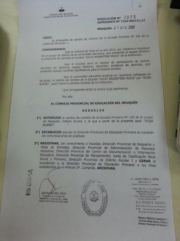 A partir de este martes, la Escuela 103 se llamará Rosa Alaniz, una de sus primeras docentes neuquinas, tras el pedido formal ante el Consejo Provincial de Educación (CPE) de un grupo de padres, directivos y ex alumnos para que deje de llamarse Julio A. Roca.