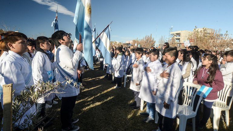 Neuquén.- El acto del Día de la Bandera fue una fiesta que reunió a más de dos mil personas en el Parque Central. Los colores patrios se multiplicaron en escarapelas, banderines y estandartes de todas las formas y tamaños posibles. La multitud siguió atenta la ceremonia, agolpada sobre las vallas, y estalló en un aplauso cuando medio millar de alumnos de cuarto grado hicieron su promesa bajo una lluvia de papel picado.