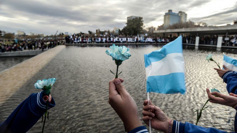 Como cierre, hubo un desfile sobre la explanada junto a las vías, que culminó con una suelta de claveles celestes y blancos sobre la fuente del cenotafio a los caídos en Malvinas.