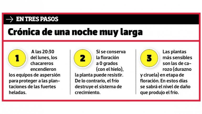 Los chacareros no recuerdan una helada tan dura y prolongada en 15 años como la de este martes, que podría perjudicar a gran parte de la producción de frutas, sobre todo la de carozo, como los duraznos y las ciruelas: casi -10 °C y más de 14 horas de frío extremo.
