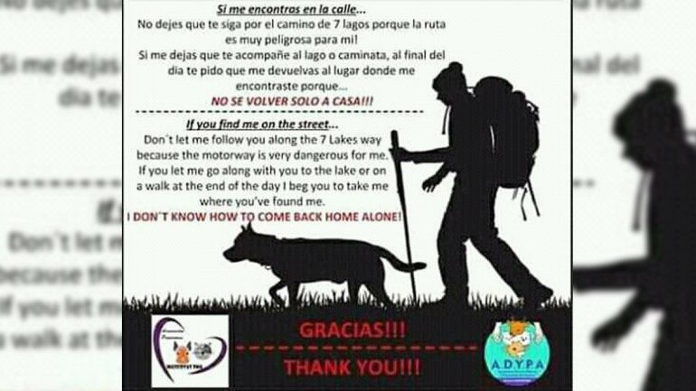 Según relató Clara Greig, presidenta de la Asociación Protectora de Mascotas de San Martín de los Andes, en noviembre del año pasado –y junto a ADYPA de Villa La Angostura- iniciaron la campaña “No se volver solo a casa”, con la que le pidieron a los turistas que no se lleven o bien, que no permitan que los sigan, ya que probablemente esos animales tengan dueño. “Es muy probable que la joven haya pensado que el perro estaba abandonado, pero cuando vimos fotos, por el estado del perro, nos dimos cuenta que tenía dueños”, inició Clara y continuó: “En noviembre del año pasado, en San Martín y Villa La Angostura, llevamos adelante esta campaña pidiéndoles por favor a los turista, ciclista y mochileros, que no se lleven a los perros, porque cuando ellos regresan a sus ciudades de orígenes, las mascotas se pierden”.