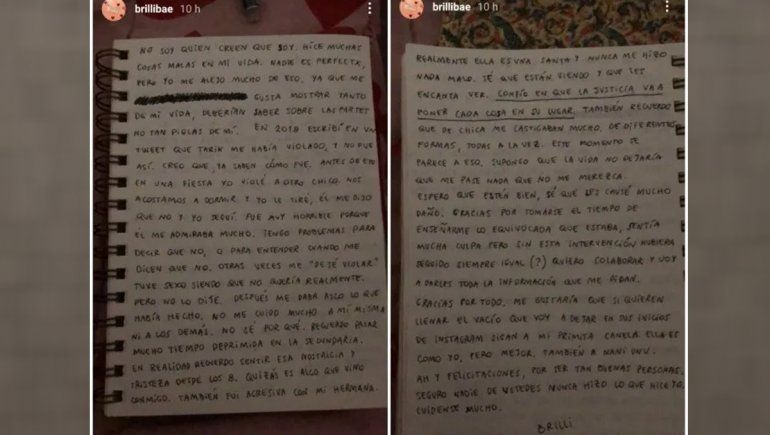 "Les quería decir que hablé con el chico, el que dije que 'lo violé', y también quería decirles que la ‘Brilli’ que dijo eso el sábado, que estaba delirando, que capaz eligió un poco mal las palabras. Yo no lo clasificaría así. Más bien, lo presioné a hacer algo que no quería. No sé si se dan cuenta que es un poco difícil que una mujer viole a un hombre, porque tienen que pasar cosas (ríe). Y bueno, el chico me dijo que está todo bien, que no le afectó, no me tengo que sentir culpable", justificó la polémica Brillibae en sus redes sociales, causando el estupor de cientos de miles de usuarios.