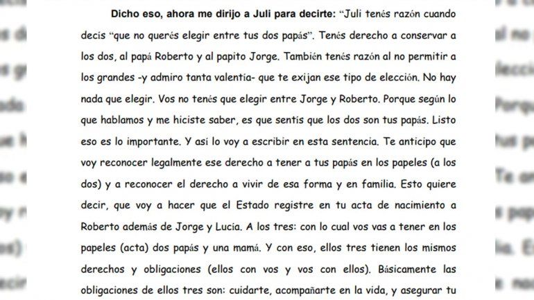 En el escrito (en el que se usó tipografía Comic Sans, que se emplea generalmente para textos informales), la jueza realizó un resumen dirigido a la nena: "Juli, tenés razón cuando decís "que no querés elegir entre tus dos papás". Tenés derecho a conservar a los dos, al papá Roberto y al papito Jorge. También tenés razón al no permitir a los grandes -y admiro tanta valentía- que te exijan ese tipo de elección. No hay nada que elegir. Vos no tenés que elegir entre Jorge y Roberto. Porque según lo que hablamos y me hiciste saber, es que sentís que los dos son tus papás. Listo, eso es lo importante. Y así lo voy a escribir en esta sentencia", escribió Rey Galindo.