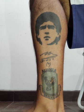 Bruno dejó ver el tatuaje que se hizo en uno de los gemelos de su pierna. Y también repasó con LM Neuquén su devoción por el Dios del fútbol y una anécdota imperdible del día que lo conoció, historia que en su momento cautivó hasta a la revista "Un Caño" que reflejó su carta a propósito de un cumple de Diego.