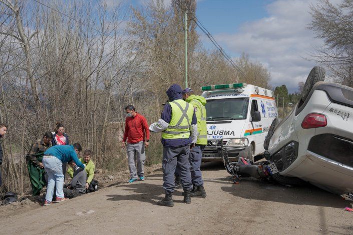 Dos conductores fueron trasladados al hospital de San Martín de los Andes tras un violento accidente de tránsito en el que un auto quedó volcado y una moto debajo de este. Ambos vehículos fueron secuestrados para que les realicen las pericias correspondientes.