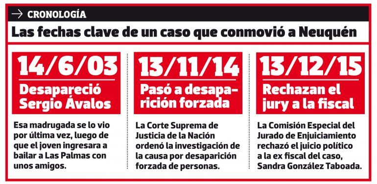 Sergio Ávalos fue visto por última vez la madrugada del 14 de junio de 2003, cuando fue a bailar a Las Palmas con unos amigos. Si bien se comprobó que el joven de 18 años, estudiante de la Facultad de Economía y Administración de la UNCo, ingresó al local bailable, nunca se supo si salió. Testigos vincularon a la seguridad del boliche con la desaparición del estudiante, oriundo de Picún Leufú. Desde ese entonces, la Justicia, la Policía y las autoridades iniciaron una intensa investigación que al día de hoy no ha tenido resultados.