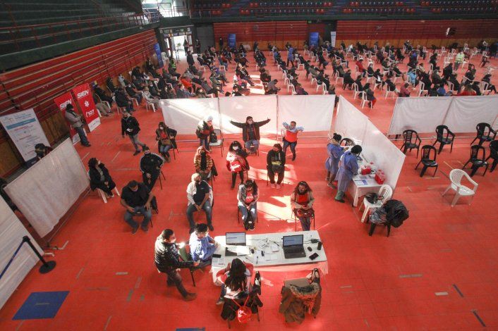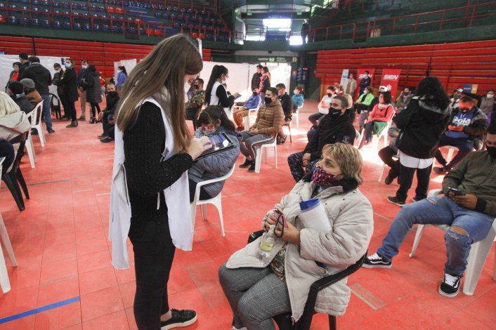 Una larga hilera con distancia social se montó en el playón del Ruca che. Aunque parecía que había una gran cantidad de personas, el proceso se desarrolló bastante rápido. Una vez que los pacientes ingresaban al estadio, allí debían esperar el turno para entrar de a doce personas a cada uno de los boxes que estaban dispuestos en los alrededores.