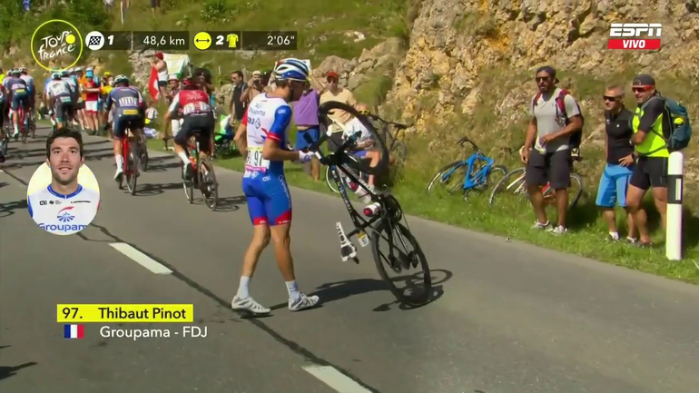 Pinot sufrió una caída en una subida, en la cual tuvo responsabilidad, pero más tarde, cuando recibió un golpe en la cara, no fue su culpa. Sin embargo, tuvo que detenerse para recuperarse y retomar la carrera.