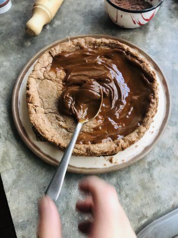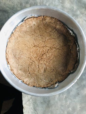 • Poner esa masa a enfriar envuelta en un papel film. Luego la estiramos con un palo de amasar y forramos un molde de 26 cm de diámetro.
