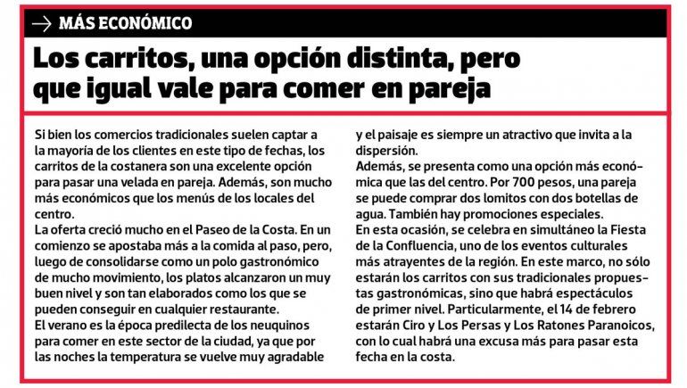 Los comercios neuquinos ya están listos para el Día de los Enamorados, una de las fechas más rentables para el rubro. En la ciudad hay una oferta gastronómica muy variada, que va desde las clásicas minutas hasta platos elaborados, a muy buen precio. Los empresarios están expectantes y esperan mucho movimiento para la noche del viernes.