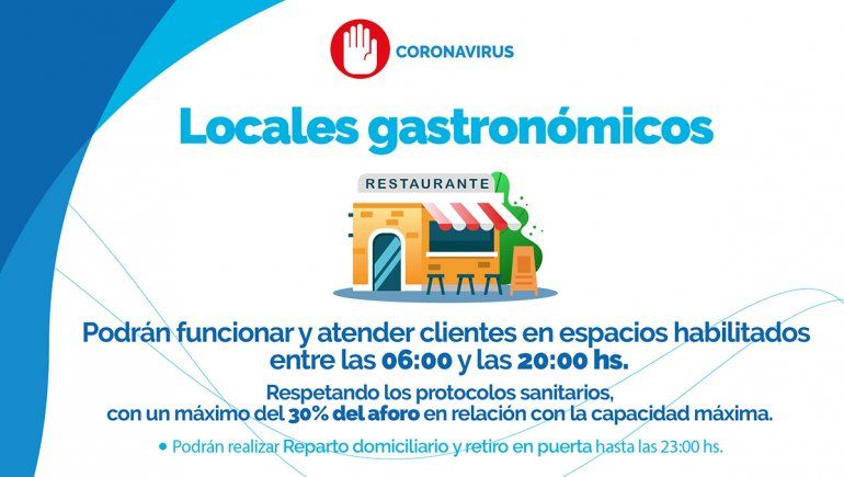 La gastronomía trabajará con un aforo del 30 por ciento, clientes dentro del local hasta las 20 y posterior a ese horario en modalidad de retiro en puerta o envío a domicilio hasta las 23. A su vez, en el caso de las farmacias y las estaciones de servicio se permite la atención las 24 horas. Lo mismo sucede con los trabajadores esenciales.