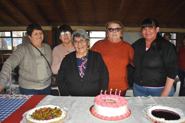Luego, entre tortas y tartas de varios gustos, las cinco cumpleañeras (Susana Irazoque, Mirta Mellado, Juana Lucero, Nínive Rojas y Celmira Cuminao) recibieron el afecto de todas sus compañeras cantándole la tradicional canción y llenándolas de buenos deseos. Después todas juntas soplaron las velitas de su torta de cumpleaños. Y el cierre fue mágico y emotivo cuando el cantante local Nicolás Vecino, con su guitarra en mano, les realizó y les dedicó un mini recital que fue muy aplaudido y acompañado con algunos bailes.