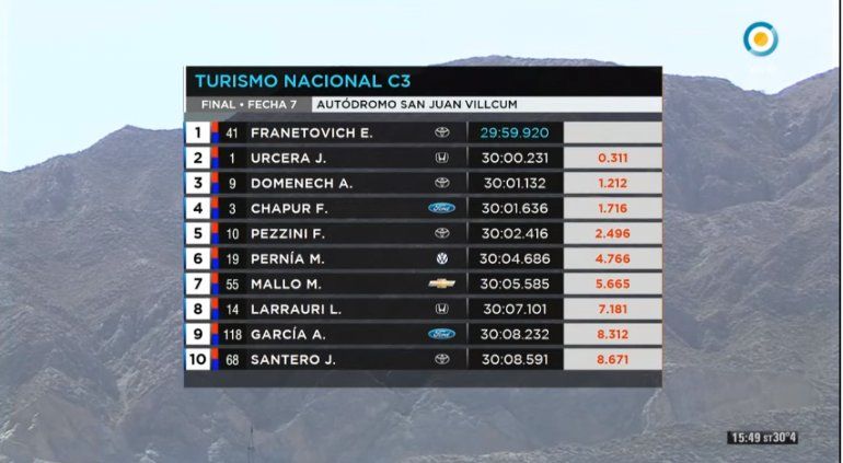 Urcera lo buscó de forma más decidida, después del segundo Pace Car y estuvo muy cerca de adueñarse del primer puesto. Hasta los últimos metros de la final, dio pelea. El tercer lugar del podio lo ocupó Facundo Domenech (Toyota), mientras que Chapur llegó cuarto y Santero décimo.