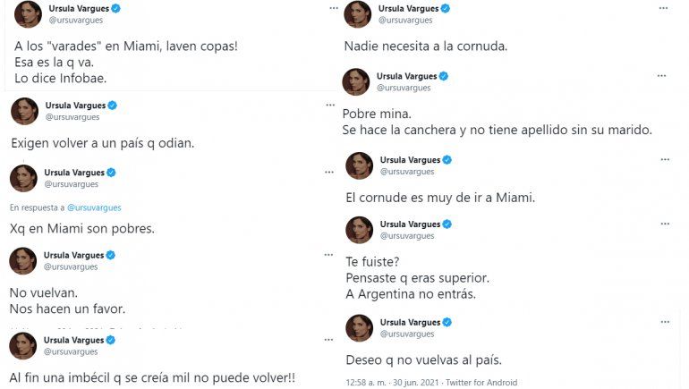 Ante esto, Úrsula Vargues tomó la posta y arremetió contra la blonda, aunque también, contra un gran número de personas que están en el exterior y no puede regresar a Argentina. “¿Te fuiste? ¿Pensaste que eras superior? A Argentina no entrás”, sentenció la ex modelo y siguió: “Andante a donde mierda quieras estar. Pero a Argentina no entrás. Nos estamos sacando una horda de imbéciles en un Twitt. Deseo que no vuelvas al país. Quedate lavando platos en Miami. Y no se te ocurra volver”.