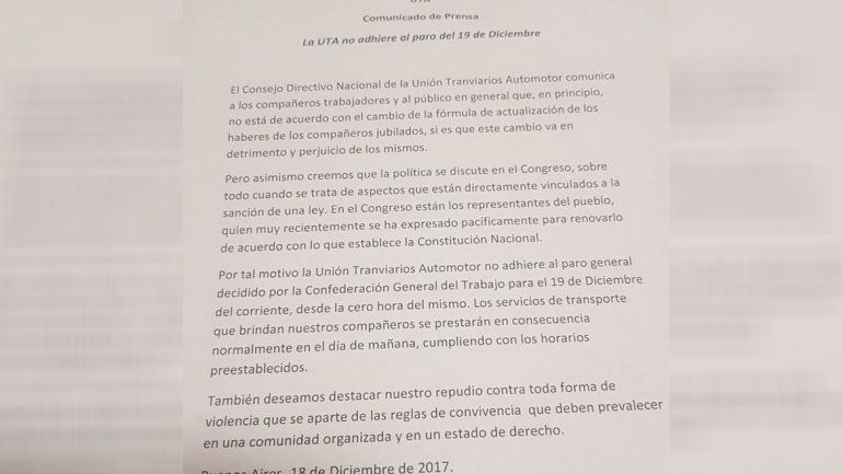 "La UTA no adhiere al paro general decidido por la CGT para el 19 de diciembre desde las 0:00. Los servicios de transporte que brindan nuestros compañeros se prestarán en consecuencia normalmente, cumpliendo con los horarios preestablecidos", anunció en un comunicado firmado por su secretario general, Roberto Fernández.