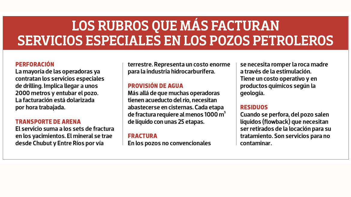 El negocio de Vaca Muerta todavía no es medible en términos finos. No sólo es el dinero que facturan las operadoras, asociadas a las empresas de servicios especiales durante la etapa de perforación de pozos, sino las compañías secundarias. Las ramas de facturación parecen infinitas, en distintas etapas de los pozos: la exploración, terminación, producción y procesamiento. Desde la venta de químicos para el fracking, el cemento, herramientas para la perforación hasta los servicios de asesoramiento en cuestiones legales y contables.