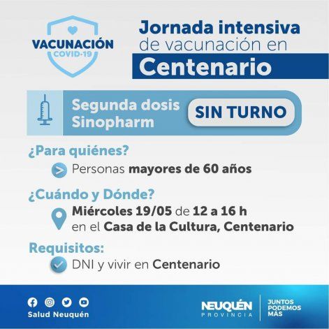 En tanto, que en Centenario será en la Casa de la Cultura de 12 a 16 para la aplicación de la segunda dosis de Sinopharm para mayores de 60 años, que acrediten residencia en esa ciudad y se hayan aplicado el primer componente hace 21 días.