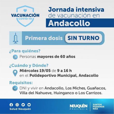 Además, de 9 a 16 se realizará la vacunación a demanda en el Polideportivo de Andacollo. Los vecinos deberán acreditar domicilio en la localidad o Los Miches, Guañacos, Villa del Nahueve, Huinganco y Los Carrizos. En ambos casos serán primeras dosis.