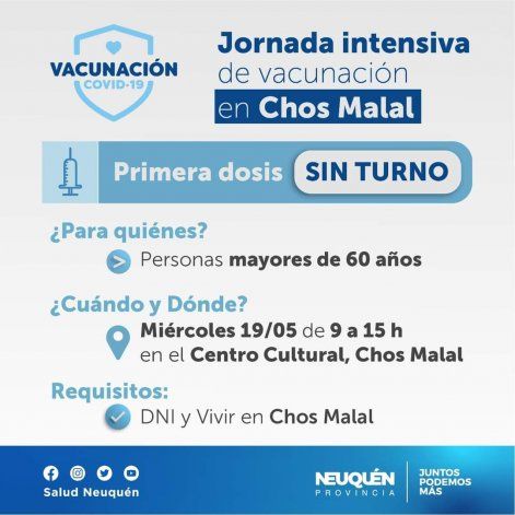 En ese sentido, Gutiérrez dio a conocer que este miércoles de 9 a 15 se realizará una jornada intensiva de vacunación en el Centro Cultural de Chos Malal para mayores de 60 años. Los interesados deben concurrir con DNI, que acredite domicilio en la localidad.