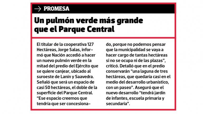 Salas contó que el director nacional de Barrios Populares, Jaime Grondona, avaló que la mitad del lote del Ejército, ubicado al oeste de la calle Saavedra, se destine a la construcción de 4500 casas. Agregó que el resto del predio se convertirá en un nuevo pulmón verde, el doble en extensión que el Parque Central (ver aparte.)
