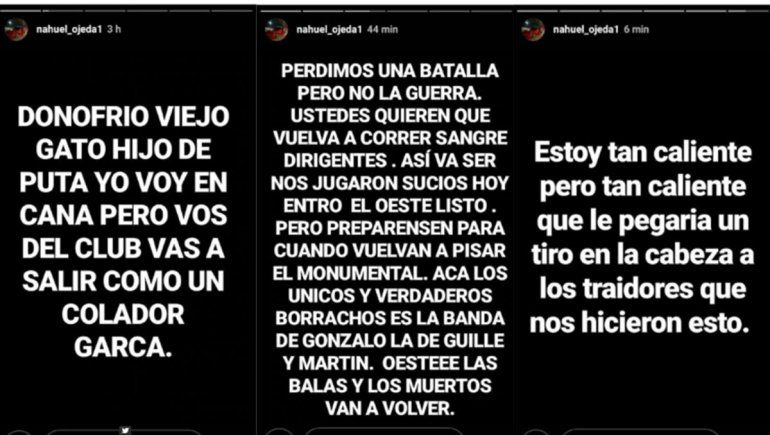 "Hola Rodolfo D´Onofrio, somos 150 los que te estamos esperando en la confitería del club. Perdimos una batalla, pero no la guerra. Ustedes quieren que vuelva a correr sangre, dirigentes. Así va a ser. Nos jugaron sucio. Ahora, entró el Oeste. Prepárense cuando vuelvan a pisar el Monumental. Acá, los únicos y verdaderos Borrachos son los de la banda de Gonzalo, Guille y Martín. Las balas y los muertos van a volver", fueron las palabras que utilizó el violento este jueves por medio de su cuenta de Instagram, que más tarde fue cerrada.