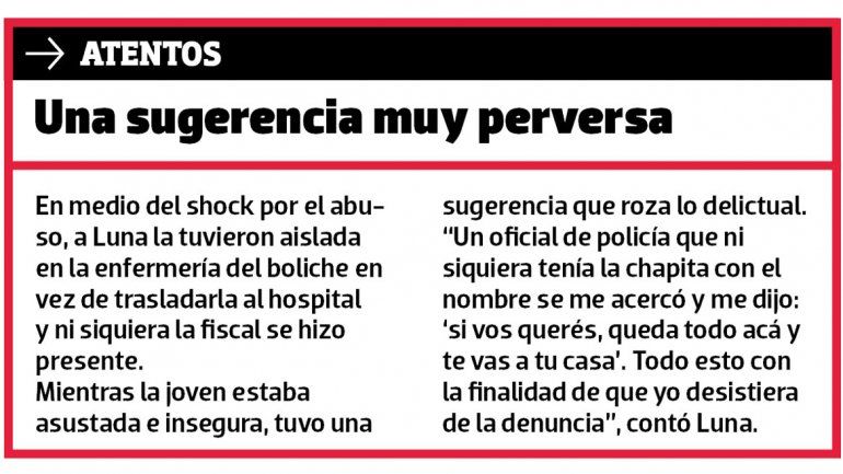 “En la enfermería del boliche me tuvieron desde las 7 como hasta el mediodía y no me dejaban ni ver a mi amigo. Tipo 10 llegaron mis viejos al boliche y no los dejaban verme, yo solo quería que mi mamá me abrazara porque estaba muy mal”, contó Luna.