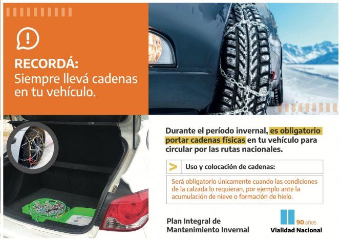 También advirtió que las cadenas se colocan solo si hay nieve en la calzada. Con hielo, agregó, no es recomendable porque deslizan. Tampoco si hay barro, ya que pueden dañar los neumáticos del auto. "En estos casos hay que sacarlas porque el vehículo no va a poder traccionar", indicó.