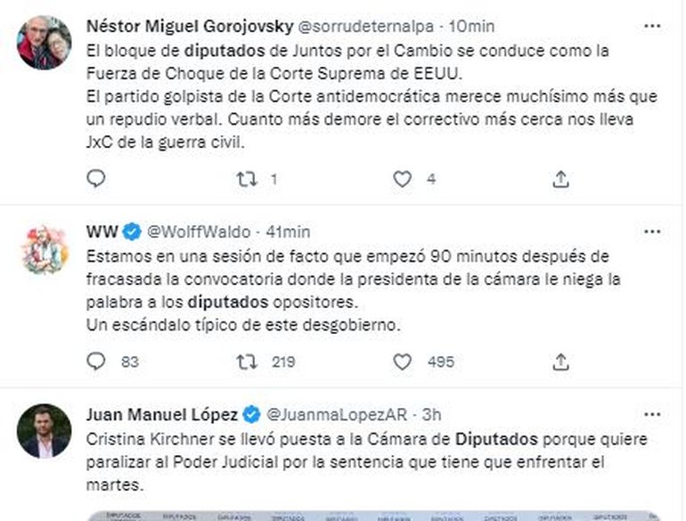 Minutos antes de que se levantara la sesión, Juntos por el Cambio había brindado una ronda de prensa en Pasos Perdidos con sus principales referentes, entre quienes estaban los presidentes de las bancadas Mario Negri (UCR), Cristian Ritondo (PRO), Juan Manuel López (Coalición Cívica), Rodrigo de Loredo (Evolución Radical) y Margarita Stolbizer (Encuentro Federal).