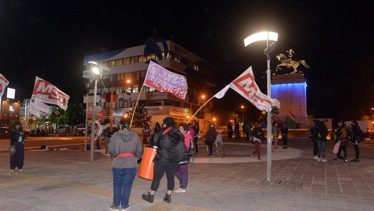 Organizaciones sociales y políticas, además de grupos feministas elevaban sus banderas en la madrugada del viernes en pleno centro neuquino a la espera de la votación.