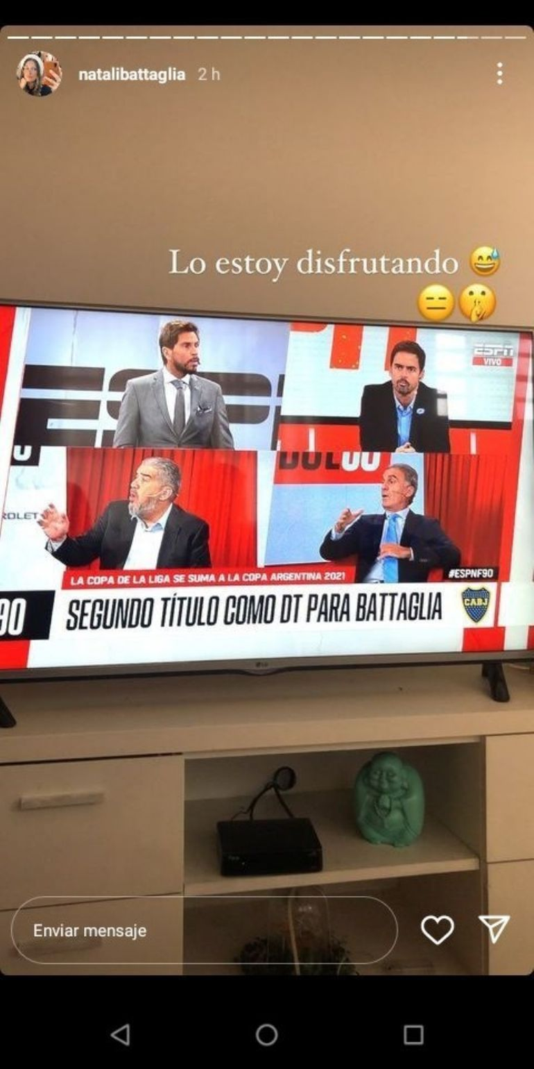 No fue el único Battaglia que dejó un mensaje para los que lo veían afuera de Boca. Natalí, su hermana, también dijo lo suyo. Fue a través de sus historias en Instagram, donde posteó una foto mirando ESPN F90, el programa de los mediodías del Pollo Vignolo. Y mientras el videograph en la TV decía "Segundo título como DT para Battaglia", Natalí chicaneó: "Lo estoy disfrutando". A ese mensaje le agregó tres emojis: uno de risa nerviosa, otro de mirada desconfiada y un último pidiendo silencio.