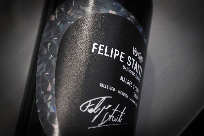 Un día vino Marcelo, que éramos amigos de antes a través de la música. (El motor de todo ha sido la música), vino y me dijo “vos como referente de la música de Mendoza y que andas por todo el mundo, tenés que tener un vino que te represente y nos represente como mendocinos. Yo no lo tenía en mi horizonte. El me ofreció su bodega, me invitó a hacer el corte que yo quisiera y ofreció toda su ayuda. Yo dije, bueno, subamos. Salimos primero con un Malbec. Los nombres de los vinos aparecieron enseguida Euforia, Vértigo, y así empezó todo. Las etiquetas también. ¿Por qué no una guitarra?, ¿por qué no una púa? eso le da una identidad diferente y personalidad en las vinotecas. El último vino que hicimos se llama “Honor”, Malbec - Cabernet Franc y logramos muy buenas puntuaciones. Hacer vinos es una gran aventura. No por el hecho del éxito en si, sino porque es algo muy grande. Voy aprendiendo de la gente, voy mucho a la bodega, ya estoy muy metido en los cortes que quiero, es algo fantástico. En un punto es una reinvención, de Felipe, yo, haciendo cosas.