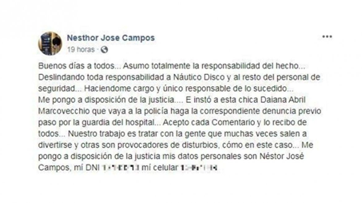 Horas antes, a través de su cuenta de Facebook, manifestó: "Haciéndome cargo y único responsable de lo sucedido... Me pongo a disposición de la Justicia e instó a esta chica, Daiana Abril Marcovecchio, que vaya a la Policía y haga la correspondiente denuncia previo paso por la guardia del Hospital".