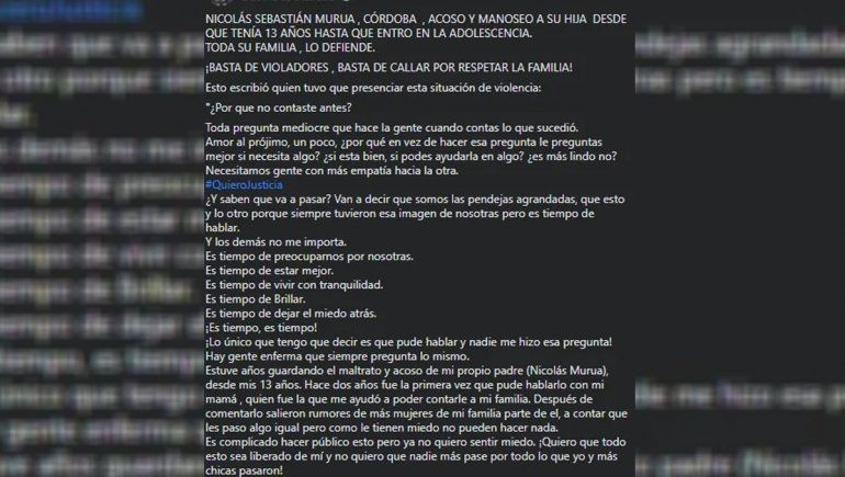 Fue así que en mayo de 2019, la joven denunció a su padre biológico Nicolás Sebastián Murúa (43) y perdió contacto con él, hasta hace unos días atrás, cuando le llegaron amenazadas de él a través de las redes sociales, tanto para ella, su novio, y su madre.