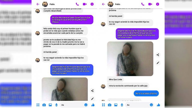“Yo te lo advertí, de mí te salvaste una vez. Soy tu peor pesadilla y pronto te volveré a encontrar. Soy capaz de todo. Ni tú ni tu madre se salvarán de mí una vez que te encuentre. Me conocés muy bien, piernas frágiles”, se lee en uno de los mensajes y luego agregó: “Que lindo fue desvirgarte. Sentir primero ese cuerpito desarrollado”.