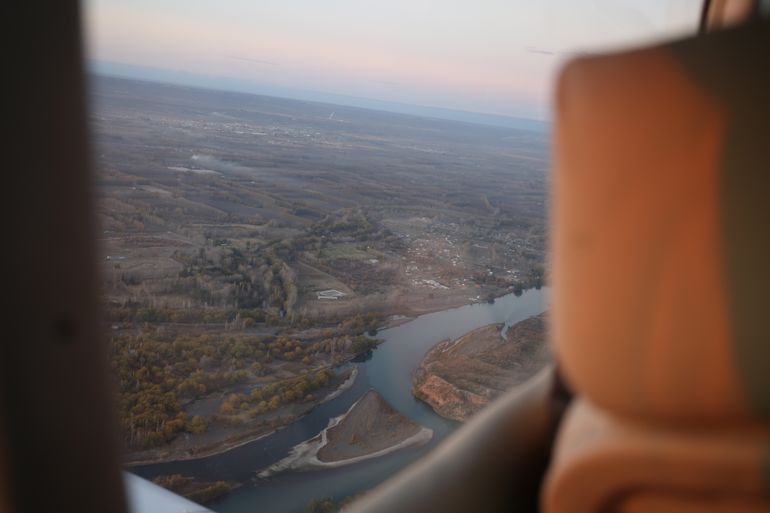 A unos cinco mil pies de altura, la ciudad pasa a ser una especie de maqueta. Los edificios le ganan a las casas y el río dibuja los límites entre las provincias. Los lagos Pelegrini y Mari Menuco, se ven a lo lejos, mientras que Roca y Cinco Saltos son las últimas localidades que se observan a punto de caer en el horizonte.
