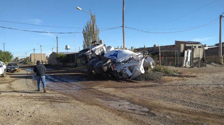 Un camión hormigonero cargado de material volcó este viernes en el Barrio del Alto de Centenario y quedó enterrado por el gran peso que transportaba.