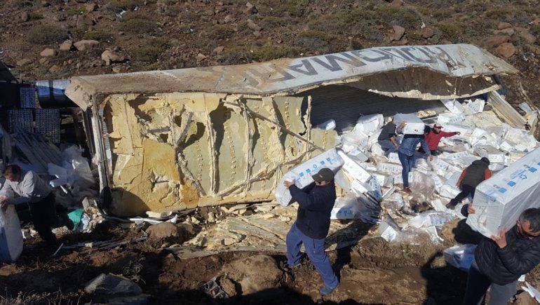 En Pampa del Viento volcó un camión y su carga, miles de cajas de Salmón, fue saqueada por lugareños que se abalanzaron contra los policías que no lograron frenarlos porque los superaron en número.