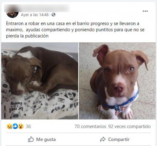 Es la segunda vez que es víctima de la inseguridad, puesto que desconocidos ingresaron a su casa y le robaron su pitbull blue de dos meses, con pelaje marrón y manchas blancas. El robo ocurrió este sábado pasado entre las 16:30 y las 23:30, en el barrio Progreso de esa localidad neuquina.