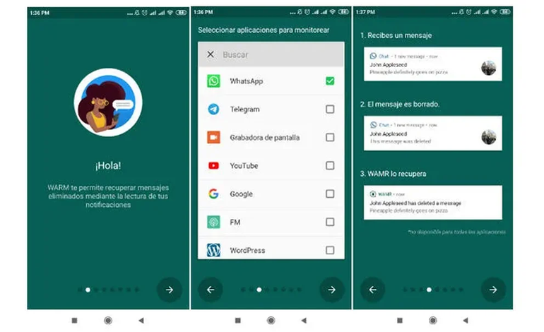 La más destacada de estas aplicaciones es WAMR, que es capaz de descubrir lo que hay detrás de un mensaje eliminado no solo de WhatsApp, también de Telegram o Facebook Messenger. Para ello, utiliza una debilidad del sistema operativo de estas plataformas.