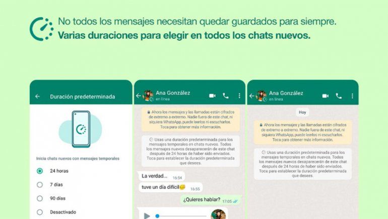 Además, WhatsApp también ofrecerá a los usuarios la opción de que sus mensajes desaparezcan después de 24 horas o 90 días, además del período de siete días con la que fue lanzada originalmente la función el año pasado.