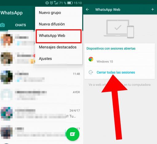 En Android se debe tocar en el botón de tres puntos que está arriba a la derecha. Cuando lo hagas, la aplicación seleccionada un menú, y en él tienes que pulsar sobre la opción de WhatsApp Web que tienes en tercer lugar. Si no ha iniciado ninguna sesión, irás a la cámara para iniciarla, pero si tienes alguna sesión iniciada, irás a una pantalla en la que se tendrá todo. Aquí, cuando ves sesiones iniciadas puedes pulsar en el botón de cerrar todas las sesiones para cerrarlas todas a la vez.